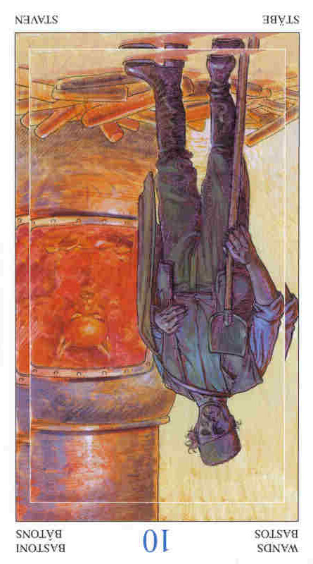 The 10 of Wands is therefore the transition from the element Fire (associated with Wands) to the element Water, associated with Cups. As you might imagine, this not the easiest of transitions.