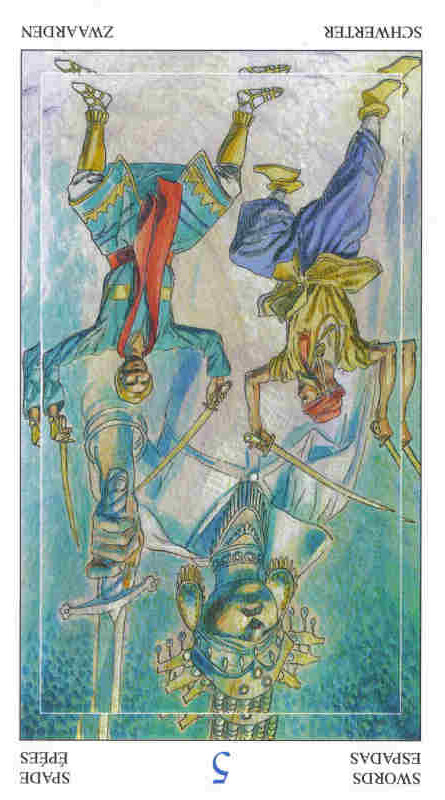 The 5 of Swords is about facing reality. The 5 is an assignment number, and in the slighly more difficult suit of Swords, it means you face a difficult challenge where your past experiences could hold you down.