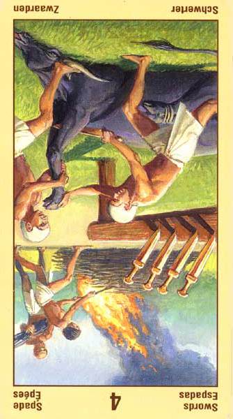 4 is the first number in the cycle of giving things shape. It's about making things real. The element of Swords also relates to making things real, so this enhances the effect so much that arrogance can cause you to exhaust yourself.