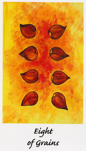 The 8 of Pentacles is about keeping up the hard work you're doing, and trying to be happy about doing that work at the same time. While the 3 of Pentacles is about completing a masterpiece, the 8 of Pentacles is about doing the apprentice work that makes you a master of your trade.