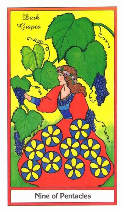 The 9 of Pentacles represents earned rest. The element Earth, attached to the Pentacles suit, appreciates the rest that completion of hard work brings. This is a good time for games and relaxation.