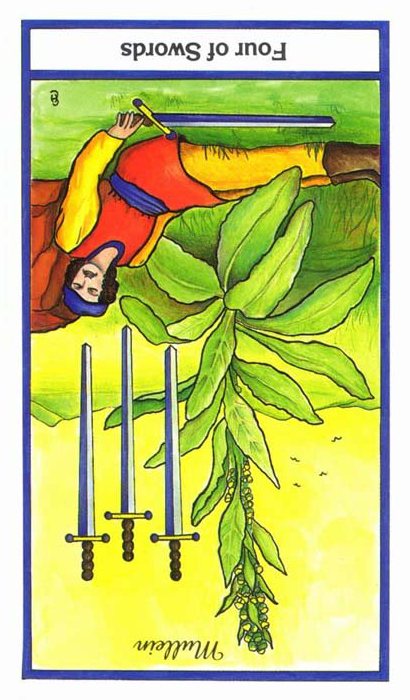 4 is the first number in the cycle of giving things shape. It's about making things real. The element of Swords also relates to making things real, so this enhances the effect so much that arrogance can cause you to exhaust yourself.