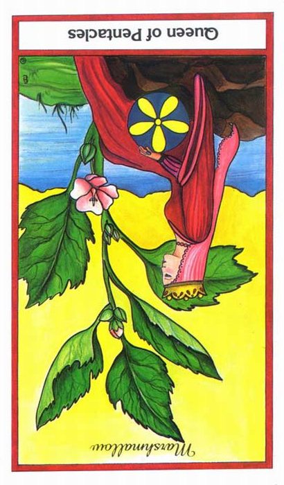 The Queen in the suit of Pentacles becomes aware of her Earthly attributes; she's reliable and sober, able to give good advice.