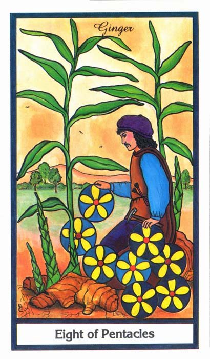 The 8 of Pentacles is about keeping up the hard work you're doing, and trying to be happy about doing that work at the same time. While the 3 of Pentacles is about completing a masterpiece, the 8 of Pentacles is about doing the apprentice work that makes you a master of your trade.
