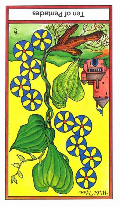 The 10 of Pentacles represents material posessions. The number 10 of Pentacles forms the links to the Ace (first card) of Wands (the first suit in the minor Arcana), and thus prepares to bring you back to the beginning of the minor Arcana, ready for a next cycle through the tarot.