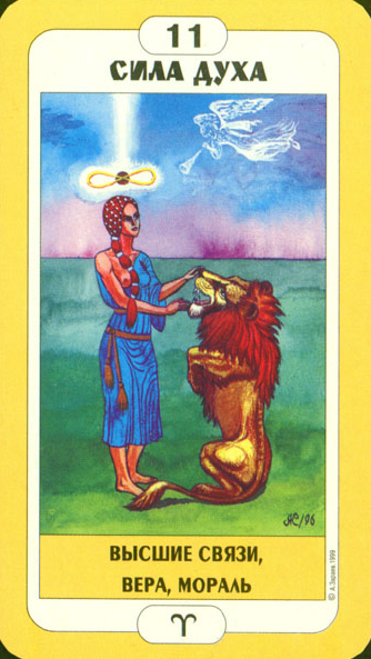 This card carries the number 11. In the Rider-Waite deck, Strength and Justice have swapped places because Waite saw links with the astrological signs Leo and Libra.