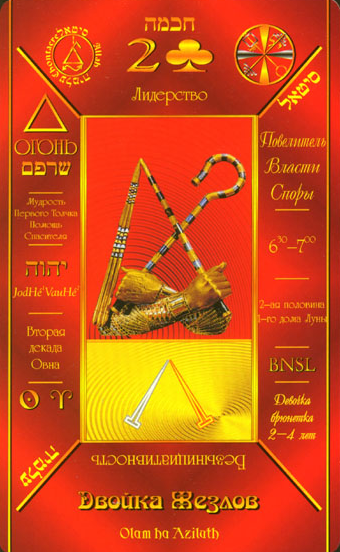 The 2 of Wands represents the research and digestion of a new idea. The number of this card and it's element are somewhat in conflict; while the 2 is focussed inwards, the Wand's element fire is outgoing. Fire wants to steam ahead while the blackbox 2 asks for patience.