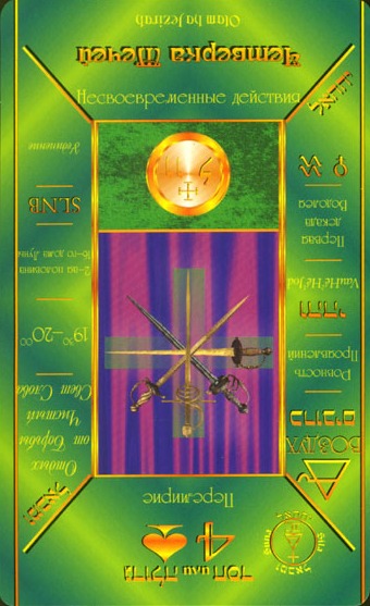 4 is the first number in the cycle of giving things shape. It's about making things real. The element of Swords also relates to making things real, so this enhances the effect so much that arrogance can cause you to exhaust yourself.