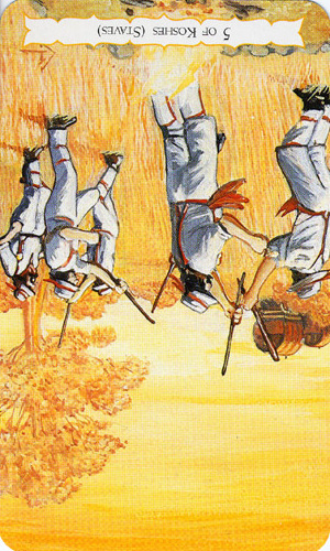 The 5 of Wands represents competition. The 5 is the second assignment number, and therefore a difficult card. 5 combined with the Wand's element fire challenges you. You'll have to fight hard for your idea, but you stand a good chance of succeeding.