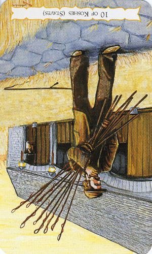 The 10 of Wands is therefore the transition from the element Fire (associated with Wands) to the element Water, associated with Cups. As you might imagine, this not the easiest of transitions.