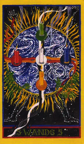 The 5 of Wands represents competition. The 5 is the second assignment number, and therefore a difficult card. 5 combined with the Wand's element fire challenges you. You'll have to fight hard for your idea, but you stand a good chance of succeeding.