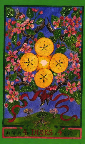 The 4 of Pentacles is about holding on to what you got. The number 4 represents structure and order, and fits well with the suit's element, Earth.