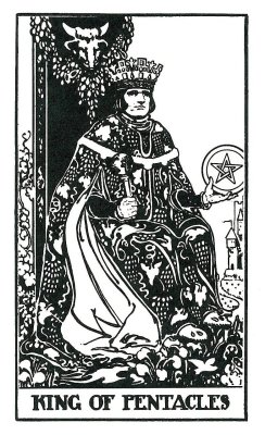 The King of Pentacles uses his Earthly attributes to rule. He goes about his work like an old style business man; he avoids unnecessary risks, aims for real results, and acts from confidence.