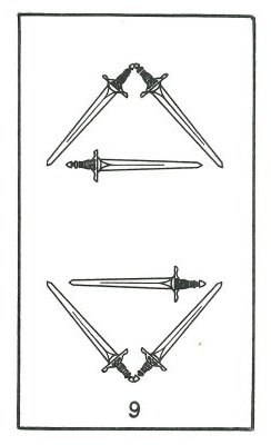 The 9 represents rest after work, which is another thing (like 8) that the element Fire associated with Wands is not very comfortable with. Fire likes to keep going. This rest will probably be spent thinking about what to do next along the course to completion.