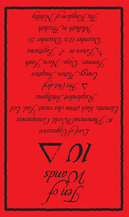 The 10 of Wands is therefore the transition from the element Fire (associated with Wands) to the element Water, associated with Cups. As you might imagine, this not the easiest of transitions.