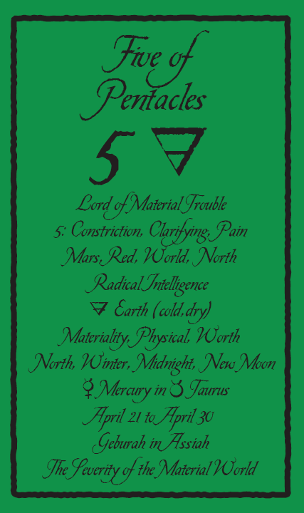 The 5 of Pentacles is an assignment-number card, and is about letting go of your securities. Pentacles element Earth (also) represents material posessions, so this card is about letting go of (some of) your worldly assets.