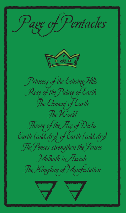 Pages explore and gather information about the road ahead, with an almost naive attitude. The Page of Pentacles is sometimes described as a bridge builder; Pentacles is the suit where the actual work is done, and the Page here enables those that follow to quickly cross difficult terrain.