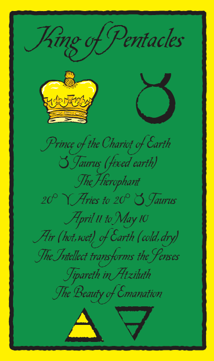 The King of Pentacles uses his Earthly attributes to rule. He goes about his work like an old style business man; he avoids unnecessary risks, aims for real results, and acts from confidence.