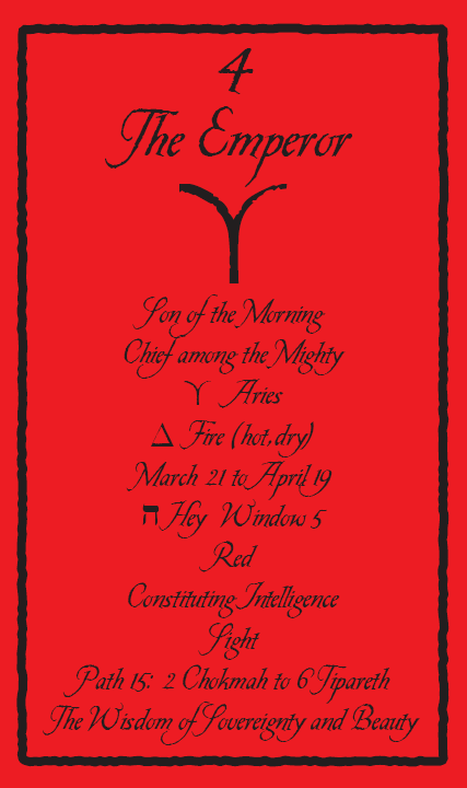 The Emperor has the number 4 attached to it. This is the number of order and structure, the number of matter; with 4 things can be built and organized.