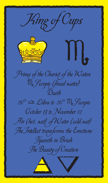 The King of Cups uses his intuition to achieve his ideals. Since Cups are turned inward, and Kings turned to the outside world, this card might be a difficult one, or it could be a powerful one.
