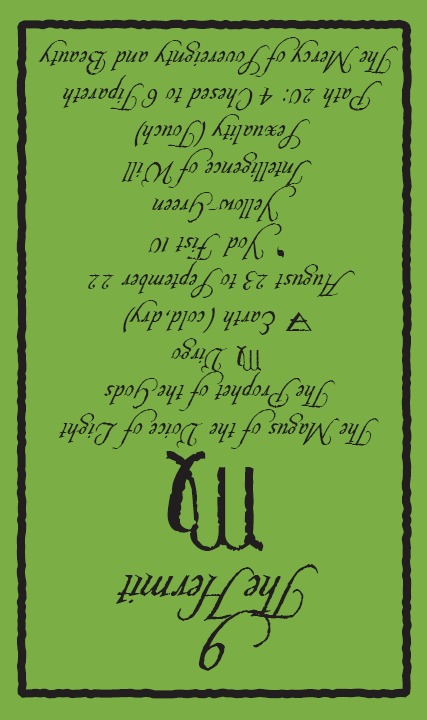 The Hermit carries the number 9. This is the highest base number. After 9 the composed numbers emerge. Therefore the number 9 is the gateway to a higher order. It is also a place to rest before embarking on the next leg of the journey.