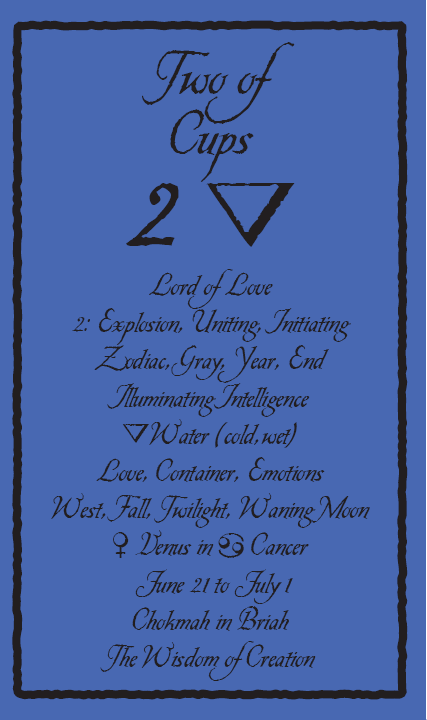 This the first assignment number of the Cups suit. Unlike Wands, with the Fire element, Cups, with the water element, has a lot more patience. Water is by nature more introspective, and this second card in the Cups suit is indeed about exploring yourself. The outcome is uncertain as always, but it usually results in better acceptance of yourself.