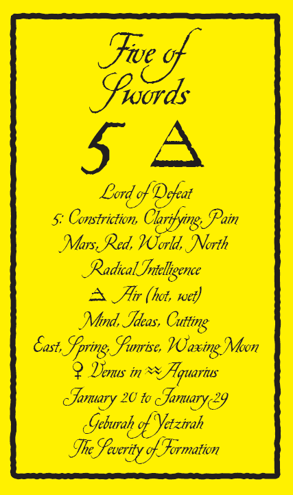 The 5 of Swords is about facing reality. The 5 is an assignment number, and in the slighly more difficult suit of Swords, it means you face a difficult challenge where your past experiences could hold you down.