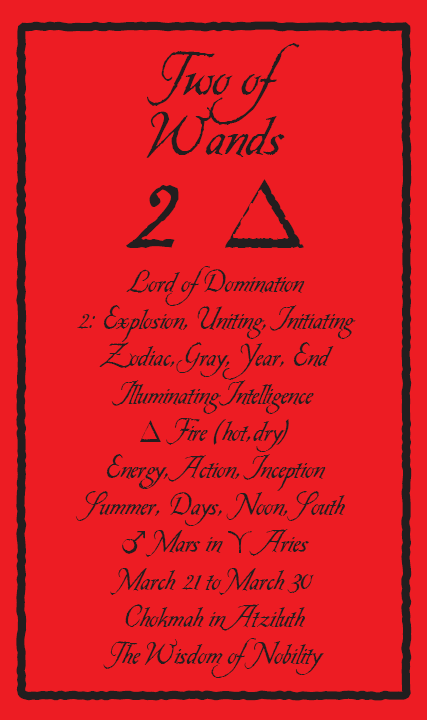 The 2 of Wands represents the research and digestion of a new idea. The number of this card and it's element are somewhat in conflict; while the 2 is focussed inwards, the Wand's element fire is outgoing. Fire wants to steam ahead while the blackbox 2 asks for patience.
