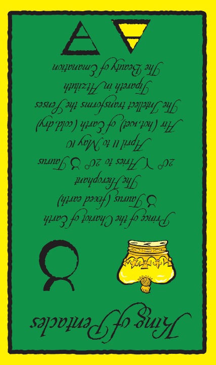 The King of Pentacles uses his Earthly attributes to rule. He goes about his work like an old style business man; he avoids unnecessary risks, aims for real results, and acts from confidence.