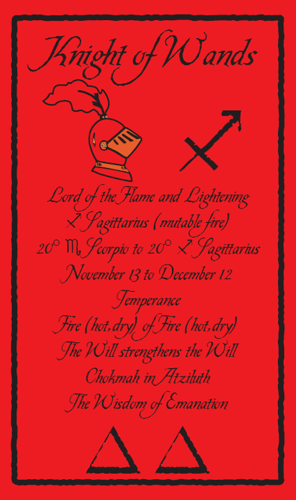 The Knight of Wands likes action and progress, but isn't too concerned with the usefulness of his actions or the ramifications to those around him.