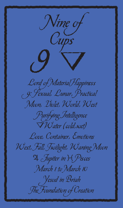 The 9 of Cups represents achievement and contentment. It is an excellent time to take some rest and enjoy yourself.