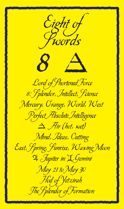 The 8 of Swords is about slowly regaining strength and energy. The 8 is an assignment number, and in the element of Swords it's a bit harder than usual.