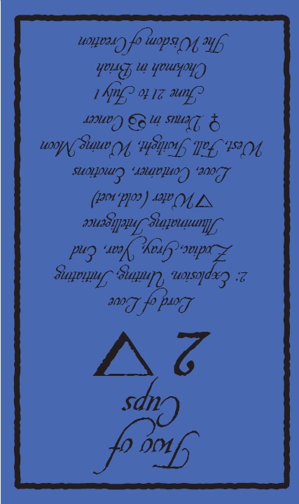 This the first assignment number of the Cups suit. Unlike Wands, with the Fire element, Cups, with the water element, has a lot more patience. Water is by nature more introspective, and this second card in the Cups suit is indeed about exploring yourself. The outcome is uncertain as always, but it usually results in better acceptance of yourself.
