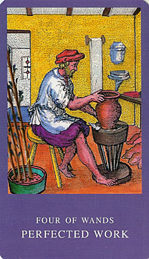 4 is the first number in the cycle of giving things shape. It's about making things real. The element of Swords also relates to making things real, so this enhances the effect so much that arrogance can cause you to exhaust yourself.