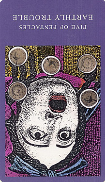 The 5 of Pentacles is an assignment-number card, and is about letting go of your securities. Pentacles element Earth (also) represents material posessions, so this card is about letting go of (some of) your worldly assets.