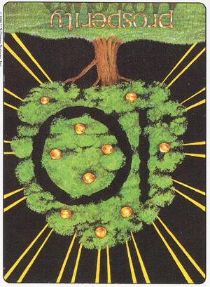 The 10 of Pentacles represents material posessions. The number 10 of Pentacles forms the links to the Ace (first card) of Wands (the first suit in the minor Arcana), and thus prepares to bring you back to the beginning of the minor Arcana, ready for a next cycle through the tarot.
