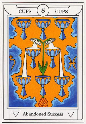 8 is an assignment number, and in the suit of Cups, it is about overcoming the urge to sink into depression caused by view on the long road ahead.