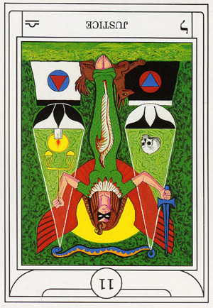 This card carries the number 11. In the Rider-Waite deck, Strength and Justice have swapped places because Waite saw links with the astrological signs Leo and Libra.
