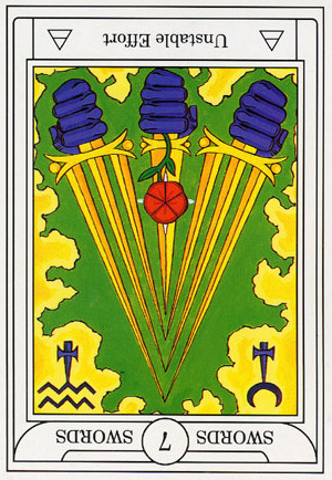 The 7 of Swords is about making slow progress because you can't trust the situation and/or people around you.