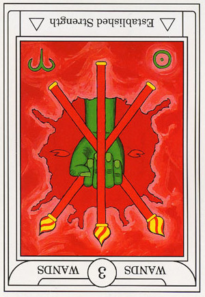 This card is about exposing your new ideas to the world. The Wand's element fire goes well with the number 3, as 3 is an output number, a number of results. Fire likes getting to results quickly.