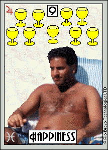 The 9 of Cups represents achievement and contentment. It is an excellent time to take some rest and enjoy yourself.