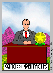 The King of Pentacles uses his Earthly attributes to rule. He goes about his work like an old style business man; he avoids unnecessary risks, aims for real results, and acts from confidence.