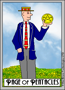 Pages explore and gather information about the road ahead, with an almost naive attitude. The Page of Pentacles is sometimes described as a bridge builder; Pentacles is the suit where the actual work is done, and the Page here enables those that follow to quickly cross difficult terrain.