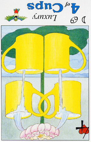 With the 4, the second cycle of this suit is commenced, where a choice between structure and feeling has to be made, where old securities have to be let go of to work towards a new future. But like Wands, Cups don't like structure much, they prefer to be free and dream rather than to make commitments and go for something.