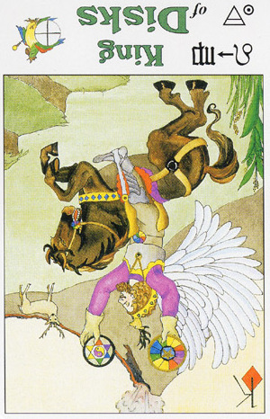 The King of Pentacles uses his Earthly attributes to rule. He goes about his work like an old style business man; he avoids unnecessary risks, aims for real results, and acts from confidence.