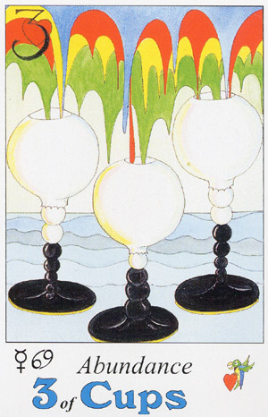 The 3 of Cups represents hope, faith and love. The 3 is a reward number and in this suit of Cups your feelings during that number will be that of joy and self-contentment.