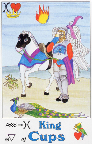 The King of Cups uses his intuition to achieve his ideals. Since Cups are turned inward, and Kings turned to the outside world, this card might be a difficult one, or it could be a powerful one.