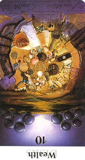 The 10 of Pentacles represents material posessions. The number 10 of Pentacles forms the links to the Ace (first card) of Wands (the first suit in the minor Arcana), and thus prepares to bring you back to the beginning of the minor Arcana, ready for a next cycle through the tarot.