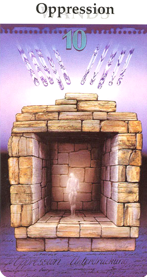 The 10 of Wands is therefore the transition from the element Fire (associated with Wands) to the element Water, associated with Cups. As you might imagine, this not the easiest of transitions.