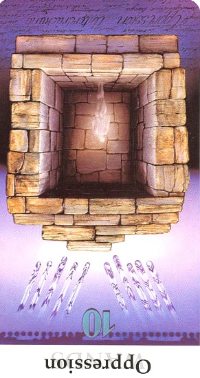 The 10 of Wands is therefore the transition from the element Fire (associated with Wands) to the element Water, associated with Cups. As you might imagine, this not the easiest of transitions.